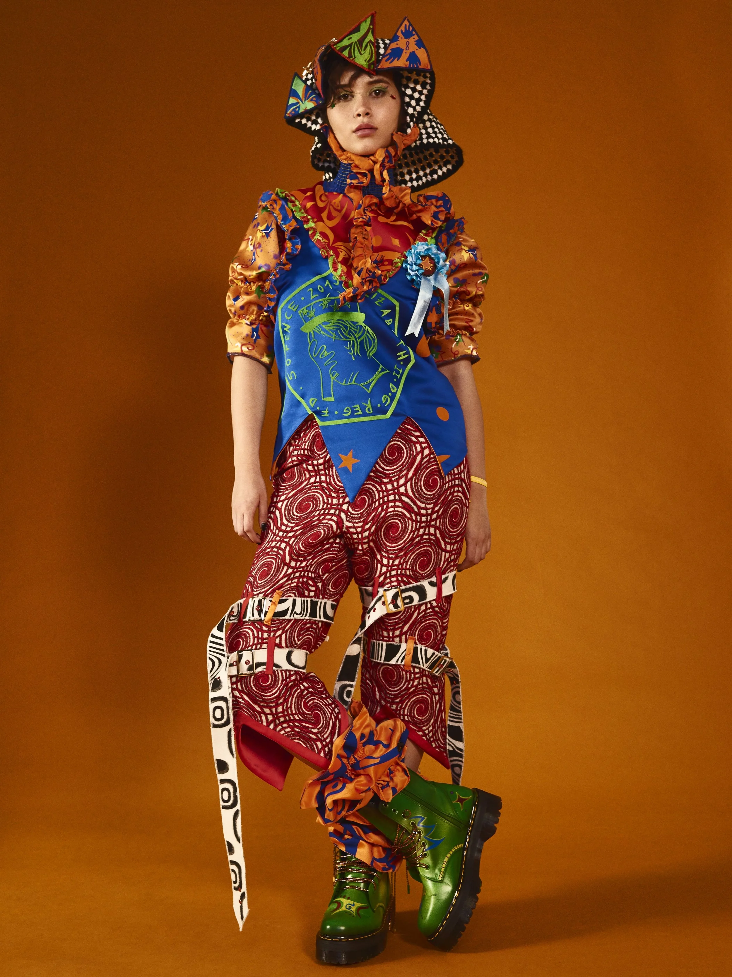 Mona Cordes collection is influenced by Clowns and Circus as well as Brexit which comes together as a colour/ pattern madness which is very pleasing to the eye but is rebellious and political at the same time. Her 6 graduate collection looks create a womenswear/ unisex collection that is fully printed. All characters belong to 'Circus Infinity' and have their own names as well as passports which allow them to still freely travel the world. A fuck you to Brexit + a yes welcome to individuality.