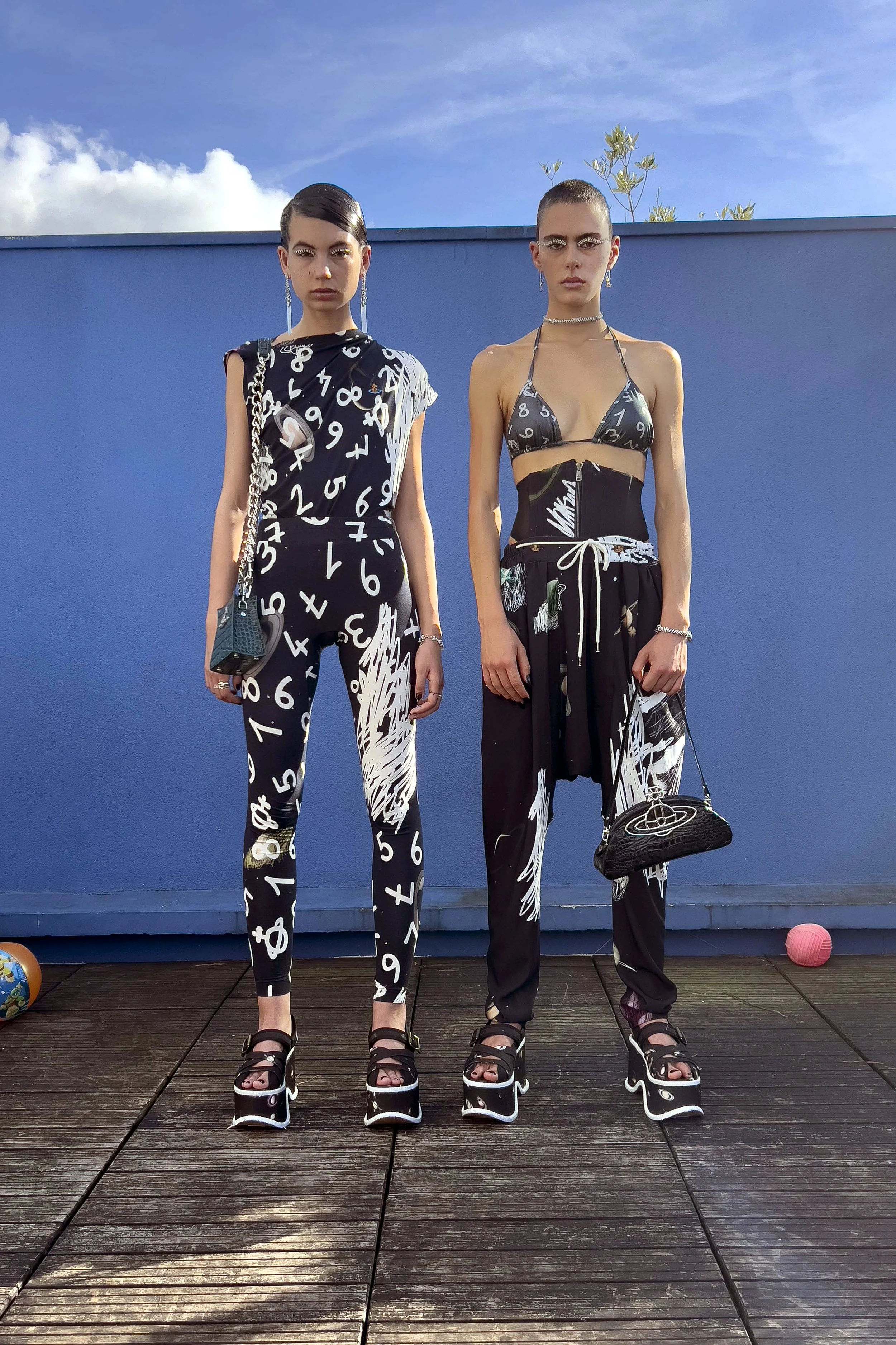 Il completo a righe bianche e blu in stile scuola inglese e il denim jacquard BORN IN ENGLAND si abbinano ai sandali platform ispirati alle Teddy Girl di Ken Russel e alla maglieria che riprende i ricami tedeschi del XIV secolo.