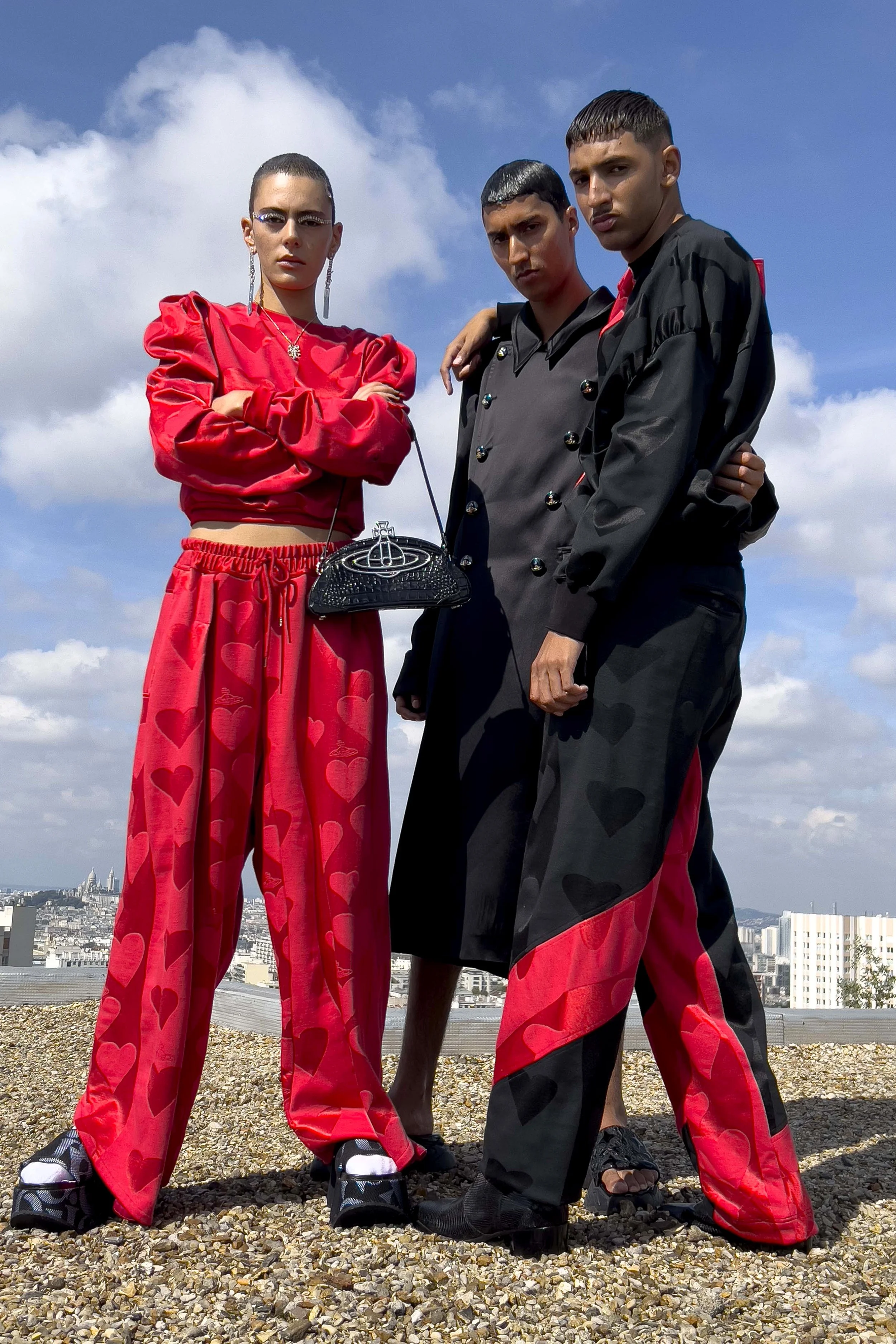Scatti ambientati nelle periferie di Parigi, dentro e attorno ai grattacieli del 20° arrondissement, dove i paesaggi urbani stanno lasciando spazio ad aree di rewilding e panorami cittadini sui tetti. Il titolo di questa collezione BORN TO REWILD appare in molteplici sembianze: sull’underwear di cotone, sul denim ricamato, sul fil-coupé formale, sui completi gessati jacquard. Stampe floreali nuove e d’archivio che si scontrano creano coreografie di fiori.