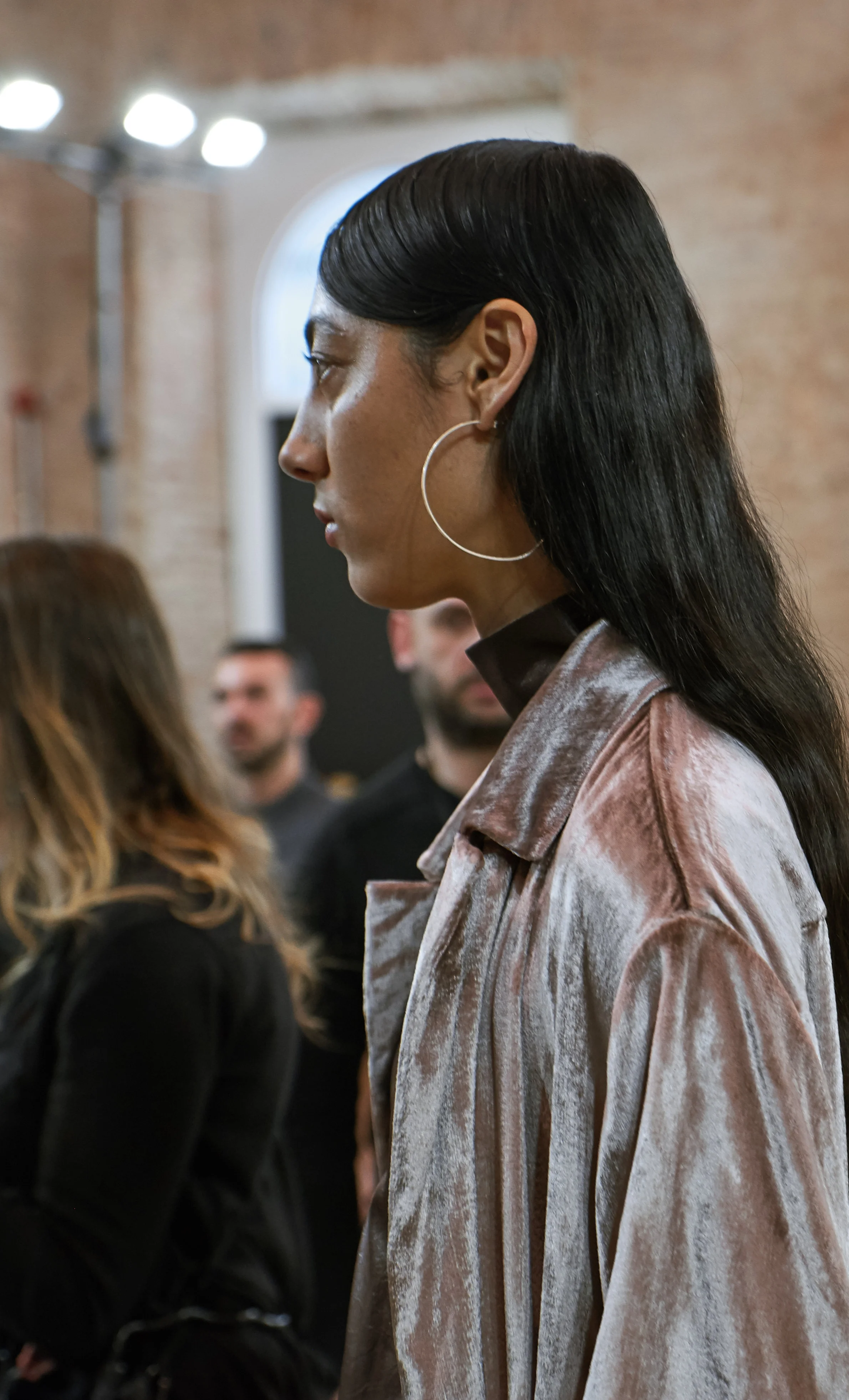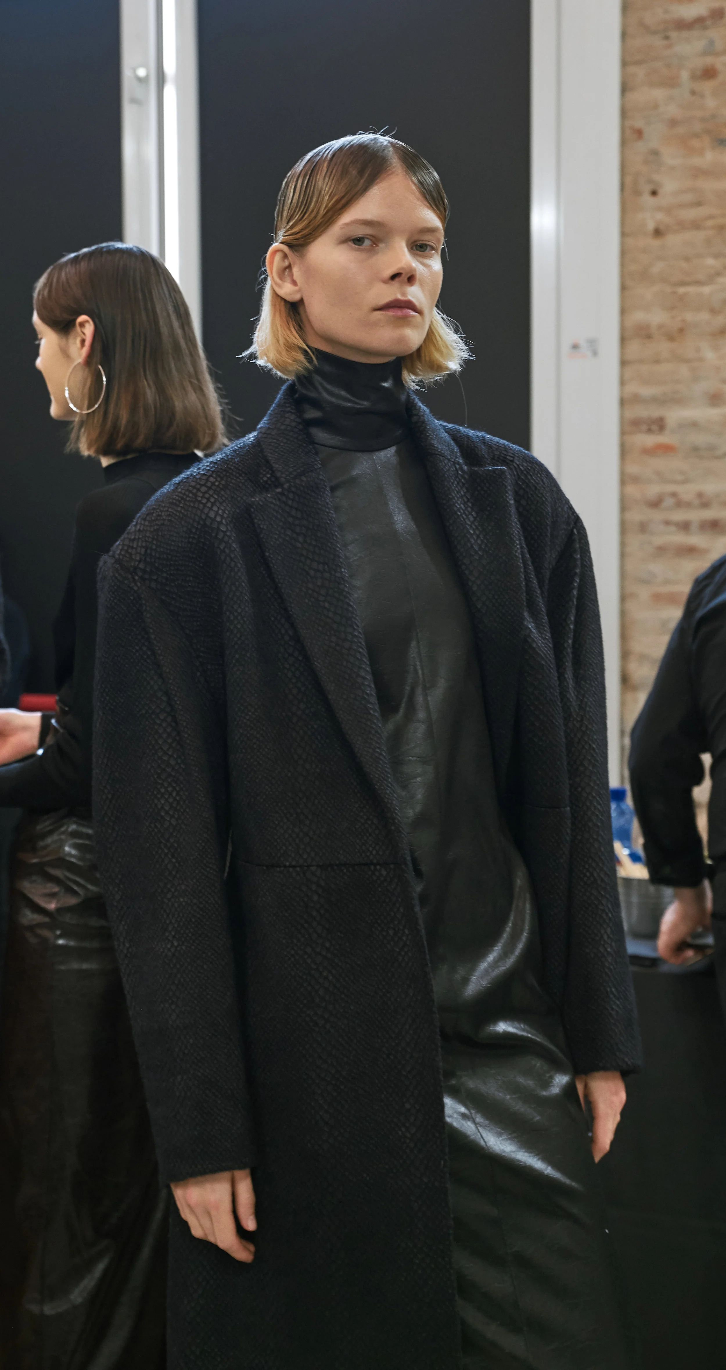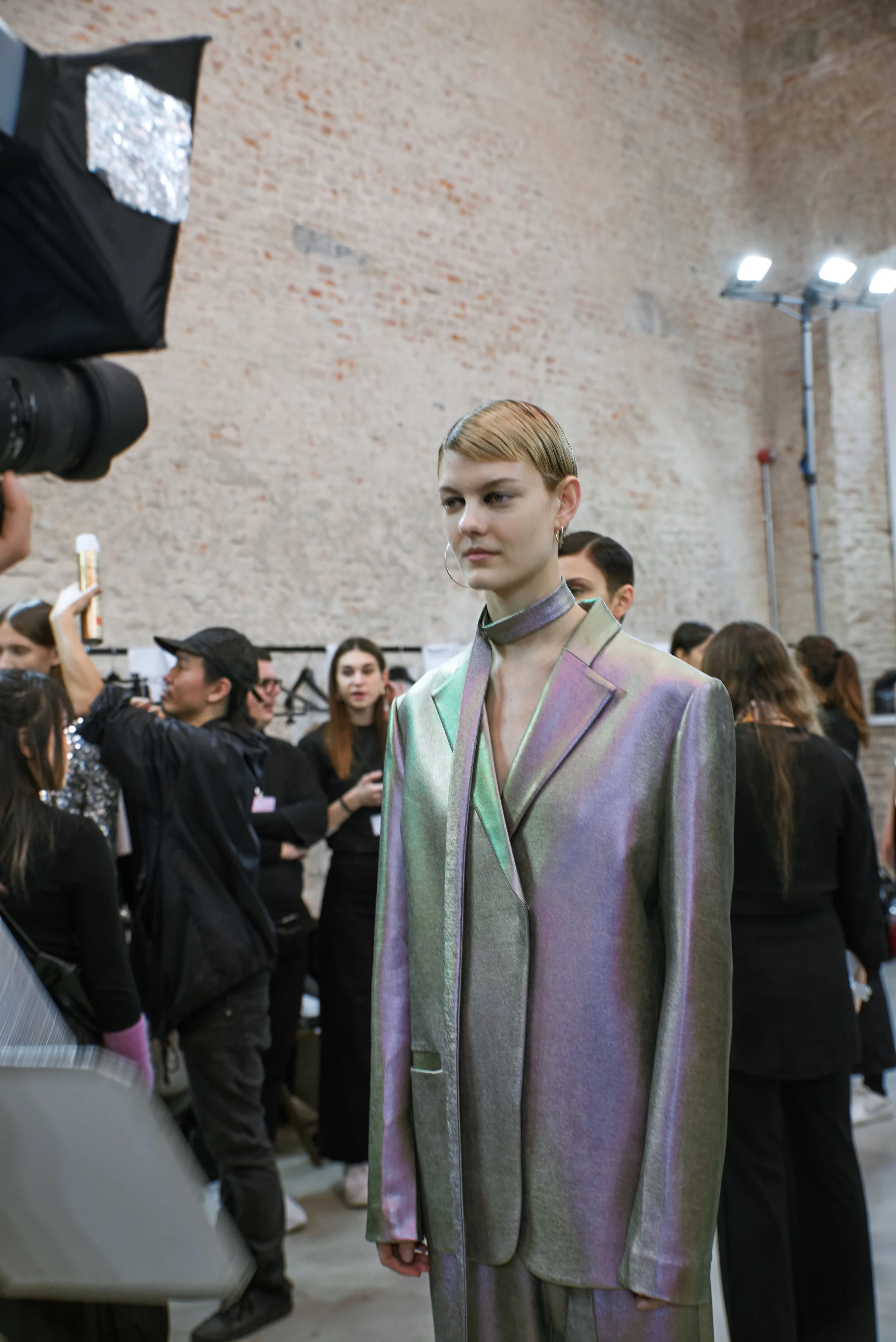 As the avatar of the series "Psychedelic Workaholics", that’s how the models that step in the catwalk of RICOSTRU wear a workwear with a futuristic allure. Faux leather garments, shimmering waterproof fabrics, high-tech coatings and prints. The shimmering waterproof down jackets and the ultra light leather embody the new ideal of "workwear of the future", imagined for space travel. The fluorescent colors of some dresses reflect the delicate soul and the dreamer of all workhaolics like the colorful dress with animalier prints.