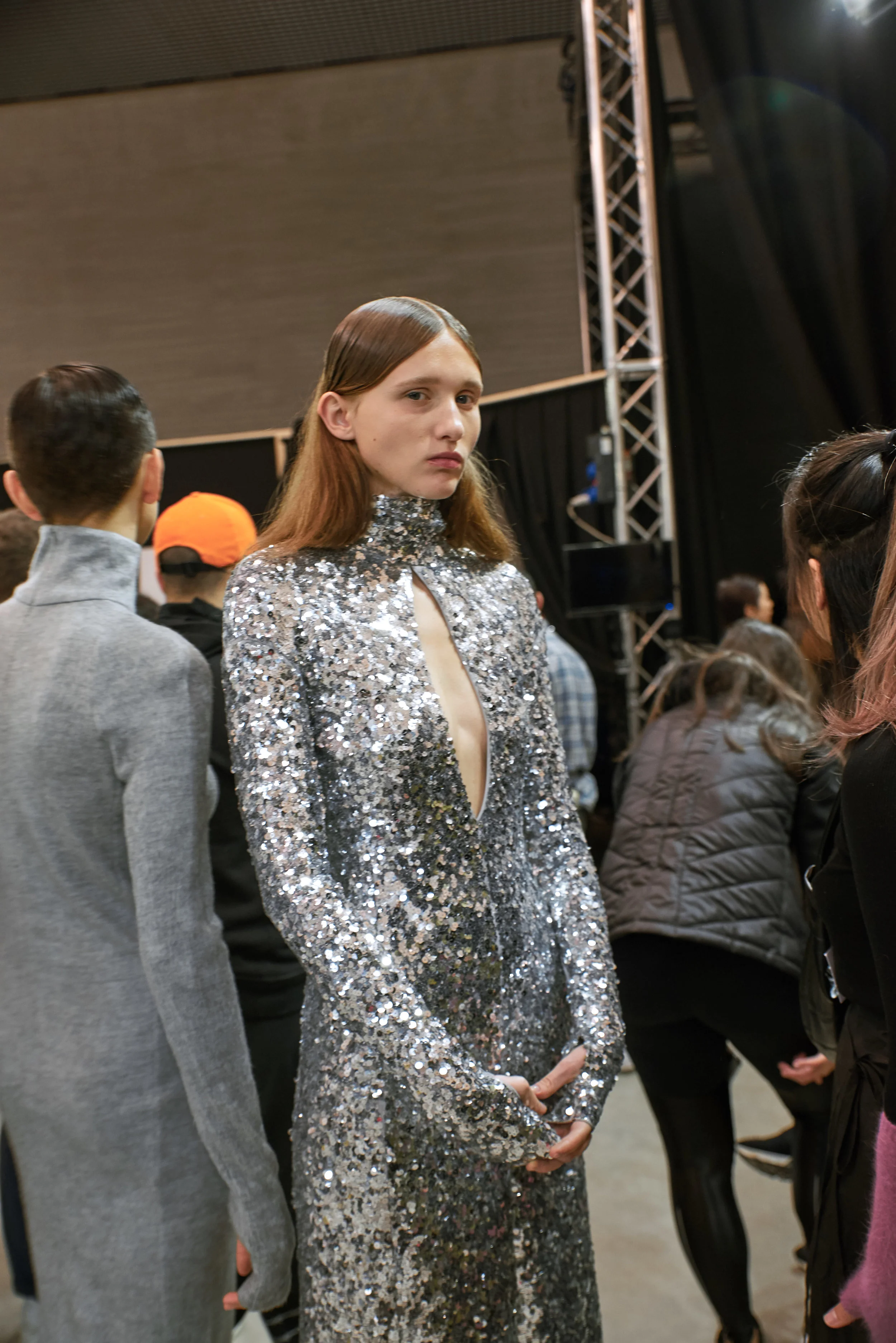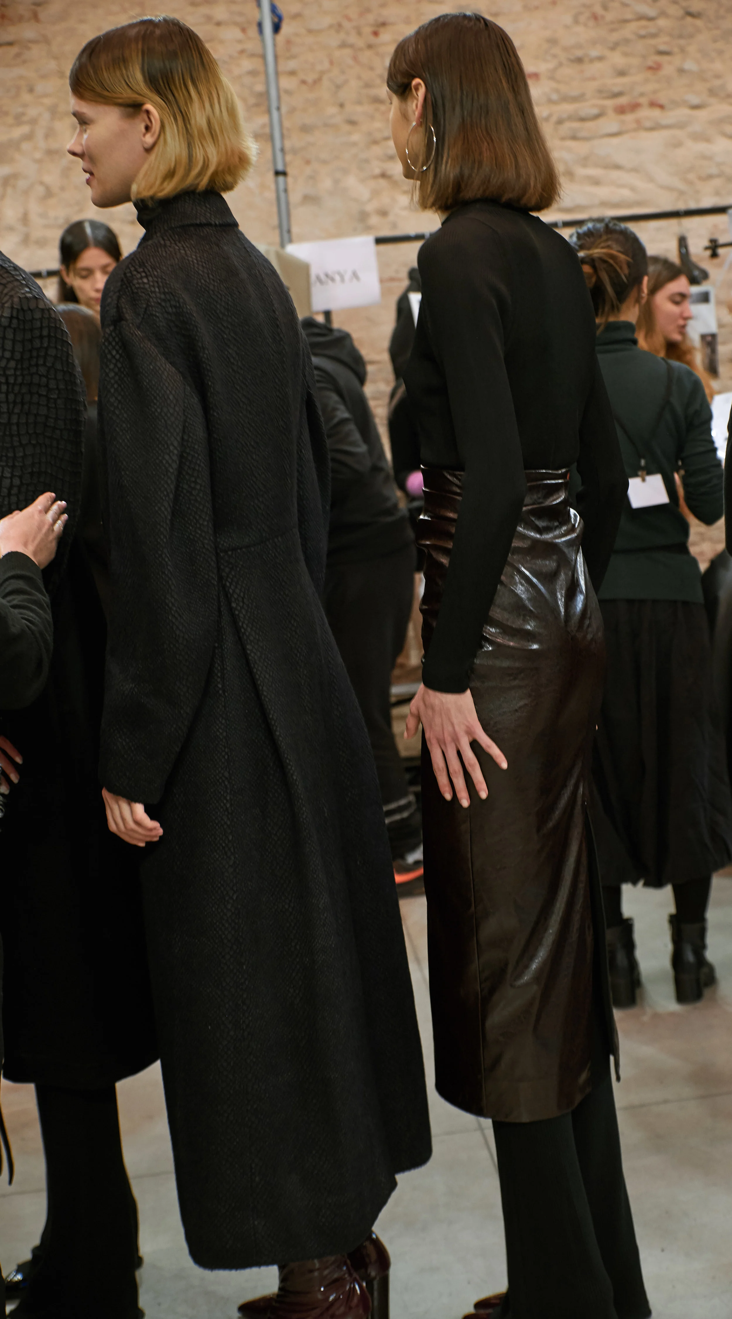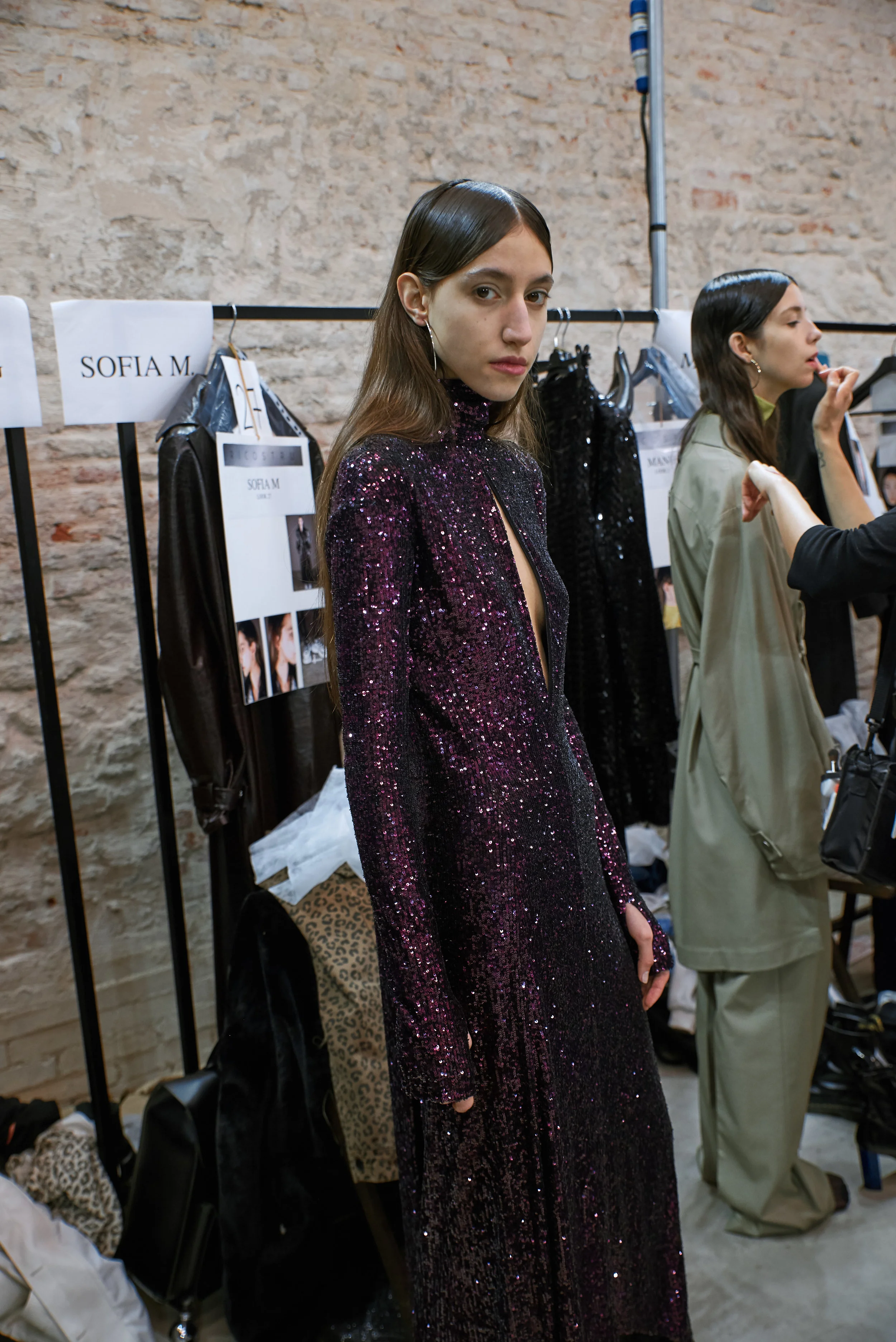 As the avatar of the series "Psychedelic Workaholics", that’s how the models that step in the catwalk of RICOSTRU wear a workwear with a futuristic allure. Faux leather garments, shimmering waterproof fabrics, high-tech coatings and prints. The shimmering waterproof down jackets and the ultra light leather embody the new ideal of "workwear of the future", imagined for space travel. The fluorescent colors of some dresses reflect the delicate soul and the dreamer of all workhaolics like the colorful dress with animalier prints.