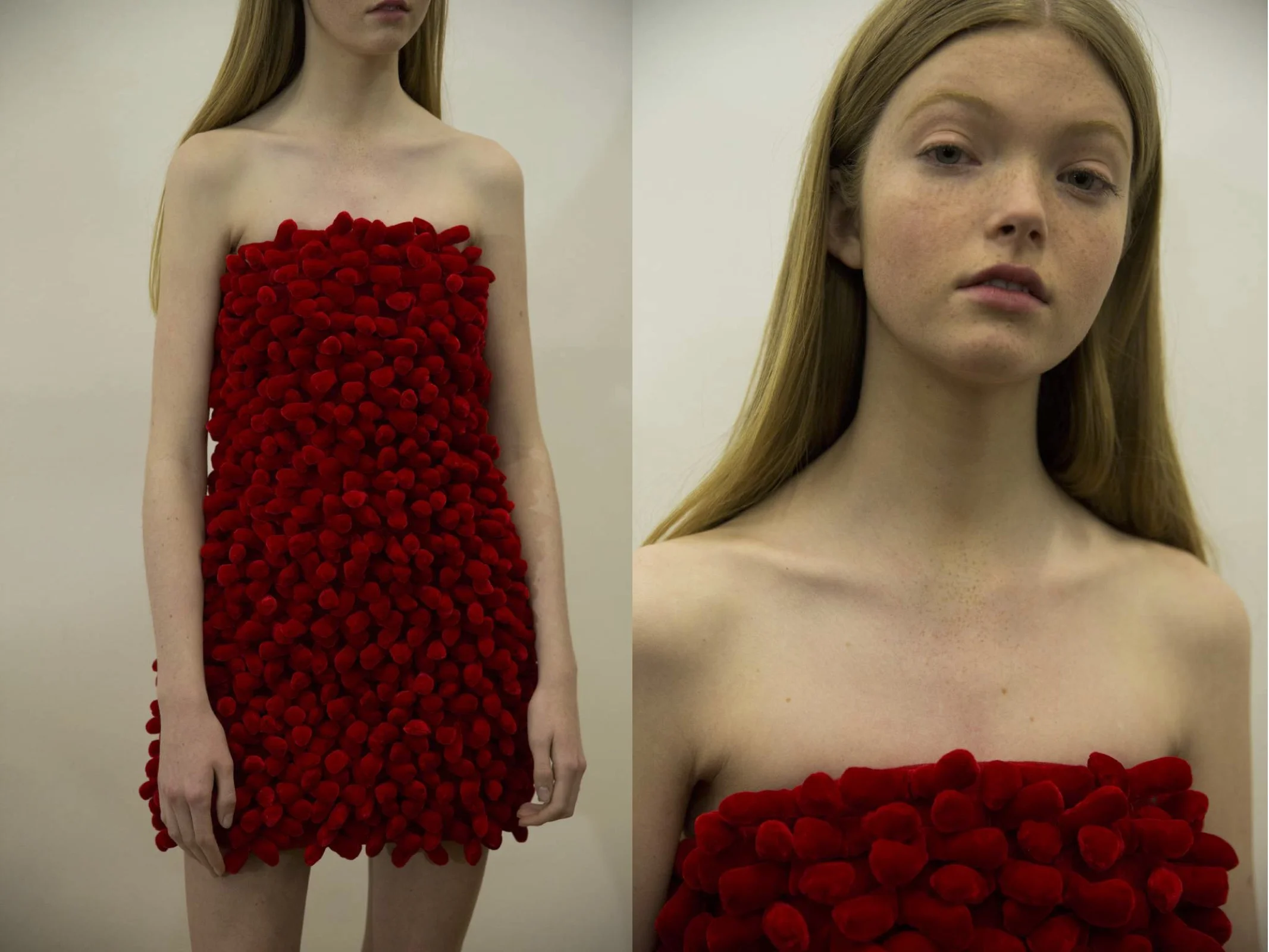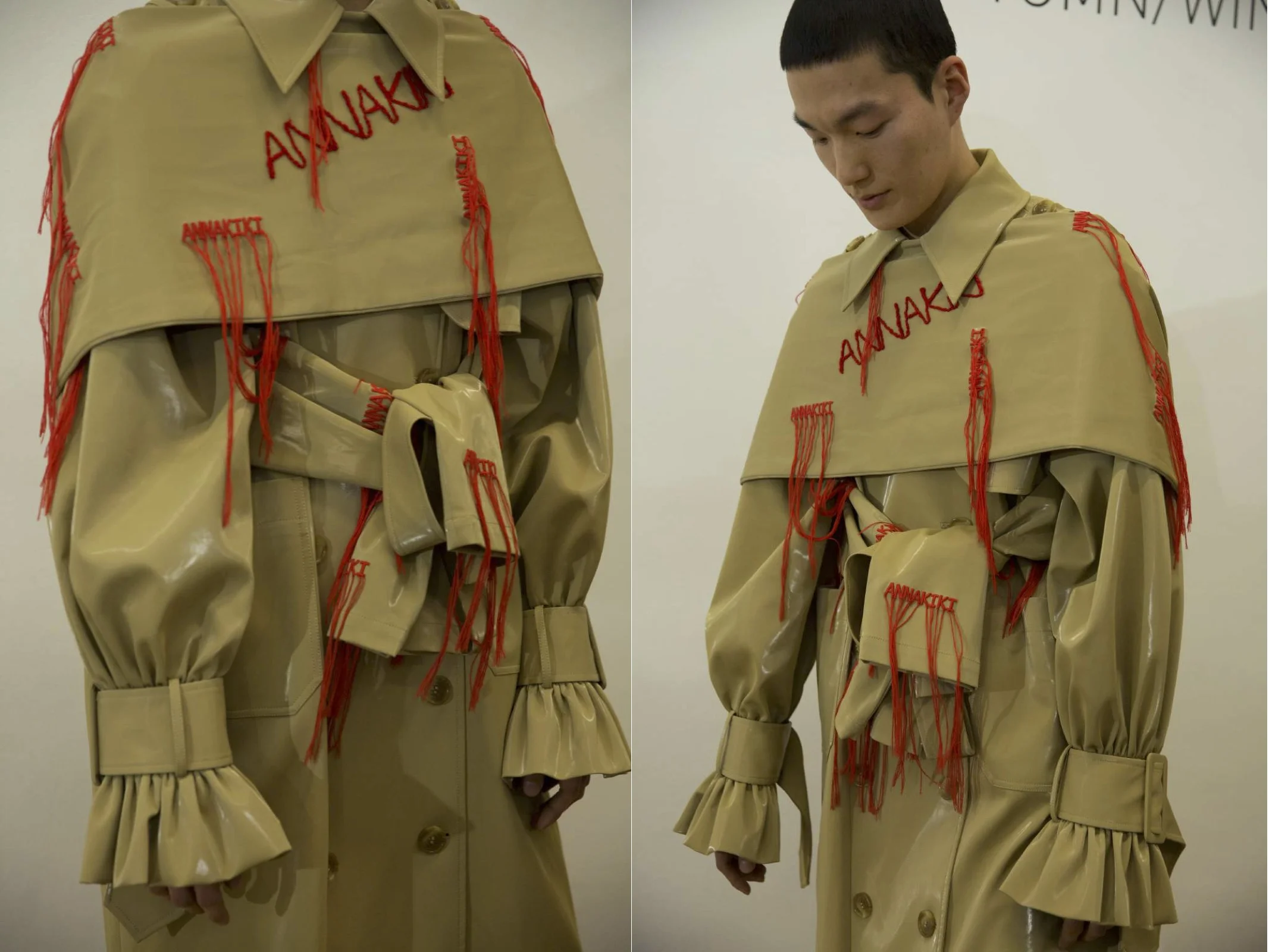 The collection breaks into these monotonous aesthetics through a daring and captivating use of colors, from flaming red and camel to fluorescent green and ash grey, from to orange toviolet, from shiny blue to black. The exploration of this new dimensions of femininity is experienced with endless experimentation of materials and representative of Anna herself: ruffles on vinyl, translucent surfaces matching plush fabrics, denim covered by dazzling details. The asymmetric structures, the contrasts between soft lines and hard cuts and interactions of winding and oversize designs, all come back as distinctive elements of the brand. But this time they are conceived with a new purpose: the exaltation of a spontaneous, free and necessarily heterogeneous beauty. ANNAKIKI renders imperfections on fabrics, made irregular and precious at the same time by holes and handmade three-dimensional embroidery, while catchy animal textures recreate the idea of a pure and not artificial beauty.