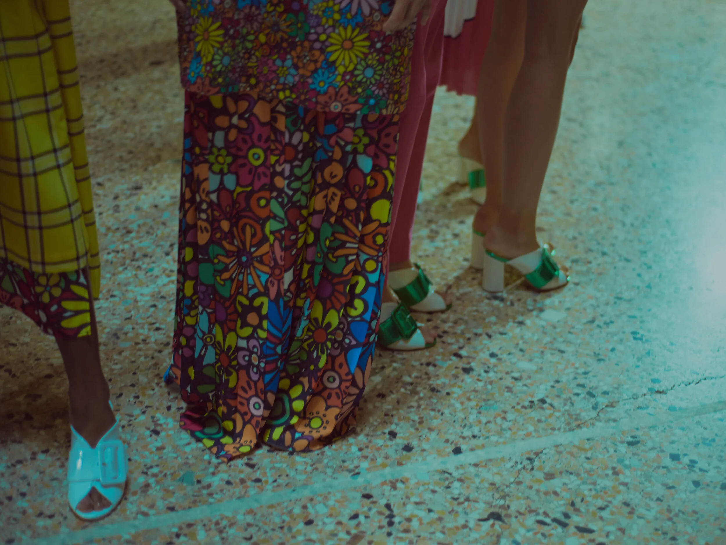 Plain-coloured jackets, trousers and shirts are enhanced by full puffed sleeves and by bell-bottoms worn with shoes with an oversized 1980’s style buckle. The knitwear, made from fine materials such as cashmere and jacquards, is mixed with colourful skirts - which have always been the iconic piece of the brand. The dresses, with ironic patterns, define the soul of this collection with a strong personality, creating an urban but elegant look. Ruches, applications, prints and lace are some of the elements that stand out on jackets, dresses, trousers, skirts and shorts. The colour pallete ranges from pastel shades for the lace dresses to violet, red, green, yellow and blue both for pieces that mix these colours and for the plain-coloured pieces.