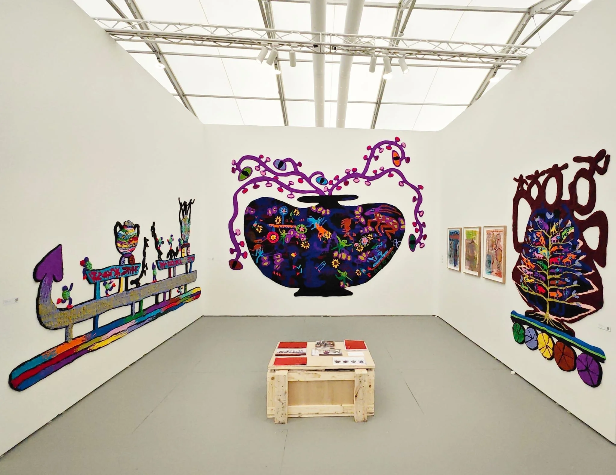 With her immersive installations of textiles and ceramics, Afra Eisma brings magical worlds to life, where emotion serves as a source of strength and trauma acts as a catalyst for self empowerment and change. The vibrant and colorful nature of Eisma's installations is a strategy to address sensitive issues and illuminate the darker sides of personal experiences. Her tactile worlds, filled with (extraterrestrial) beings and colorful figures, exude playfulness and tell numerous interwoven stories. Eisma describes her rich imagination as a politically charged terrain; a universal space for gathering, exchange, and dialogue.