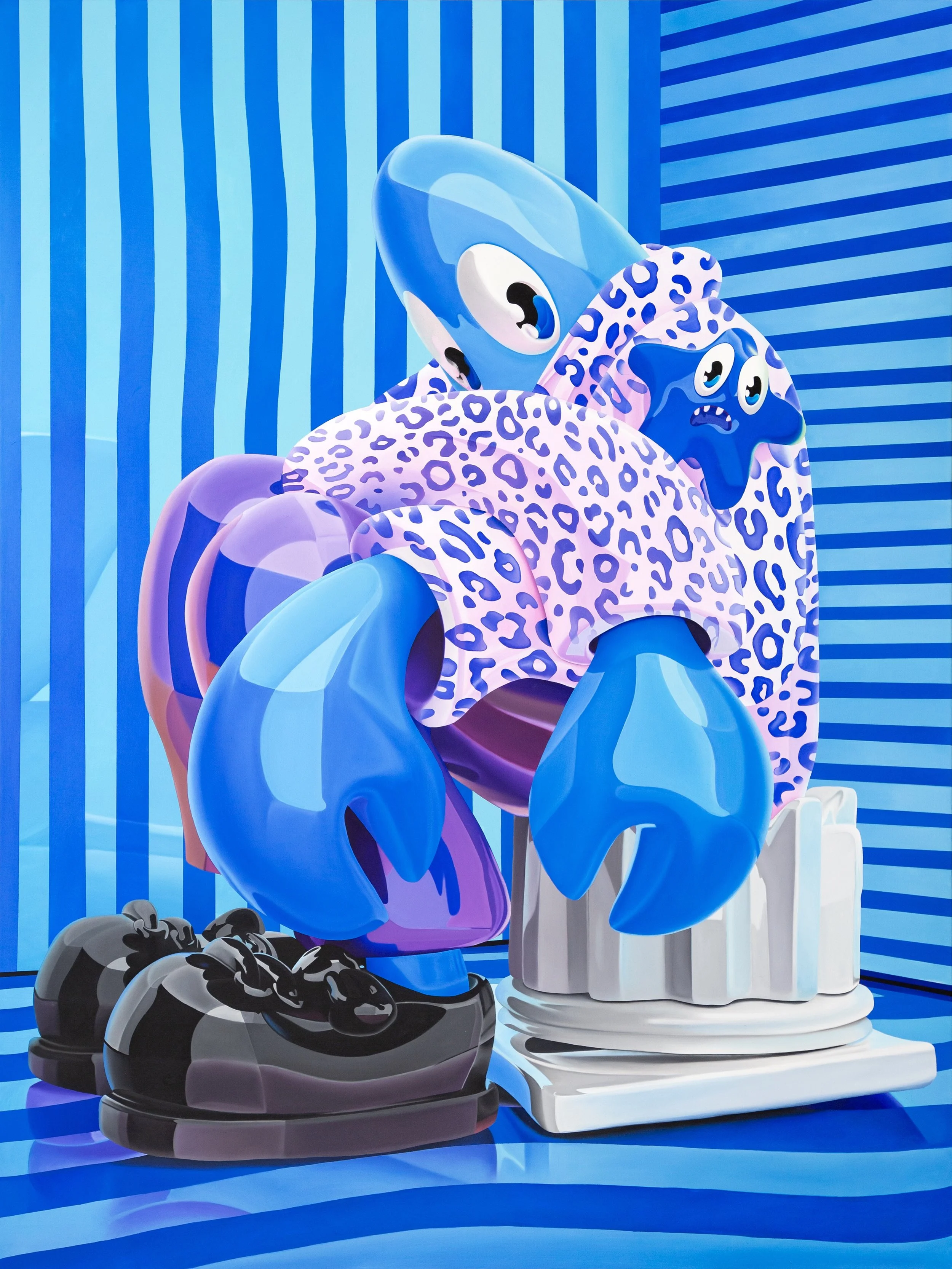 The relevance of this ancient battle scene, made thousands of years ago, plays a fundamental role in Colbert's practice. In his work titled "After Battle of Issus Mosaic," Colbert takes the composition and transplants it into the surreal and apocalyptic landscape of his retro-futuristic lobster world. By doing so, Colbert invites viewers to reconsider the enduring impact of historical art within the context of our rapidly evolving cultural landscape.