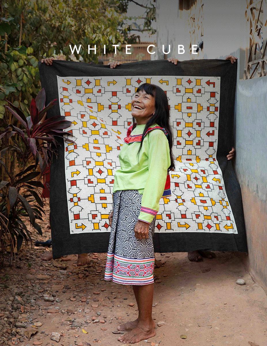 Known for her intricate, geometric paintings on textile, Flores lives and works in Peru and is part of the Shipibo-Conibo People, an Indigenous group spread out alongside the Ucayali River.