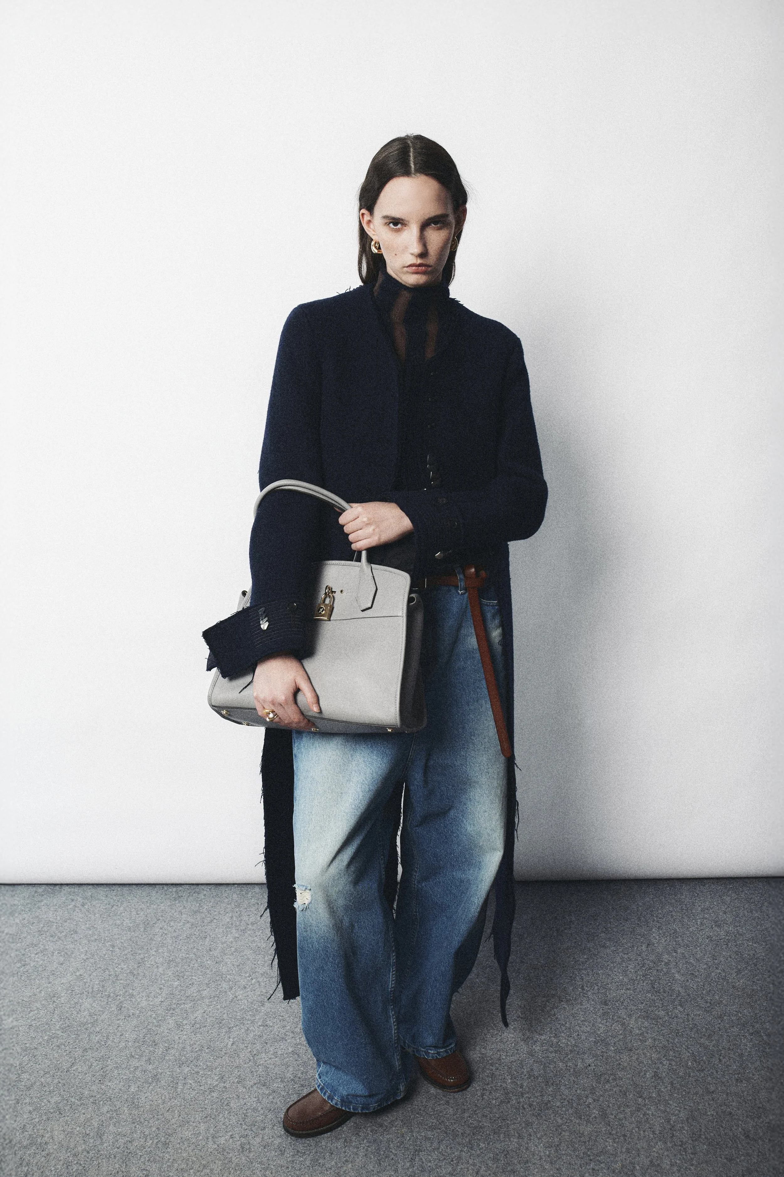 Cashmere coat and “City Steamer” Soft leather bag: all LOUIS VUITTON; Knitted top, MTOF; Jeans, LOIS JEANS; Earrings and rings, PDPAOLA; Belt, MARC O’POLO; Loafers, SEBAGO