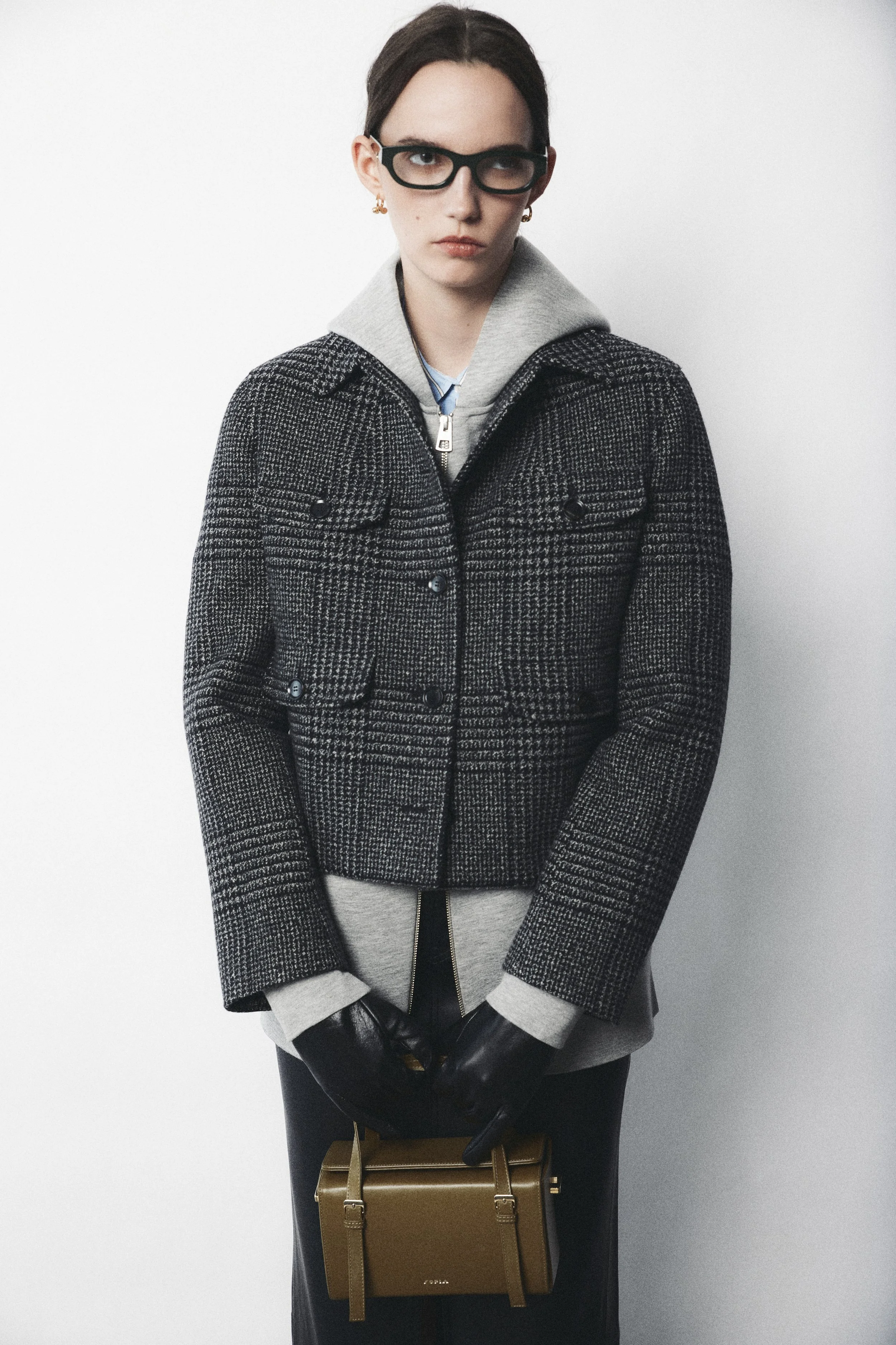 Wool and cashmere tweed Jacket, BRIONI LA DONNA; Hoodie, MARC O’POLO; Shirt, GANT; Eco-leather Skirt, LEVI’S RED TAB; Glasses, HUMA EYEWEAR; Earrings, PDPAOPLA; Gloves, MANGO;”Belmondo mini” Bag, SOFIA