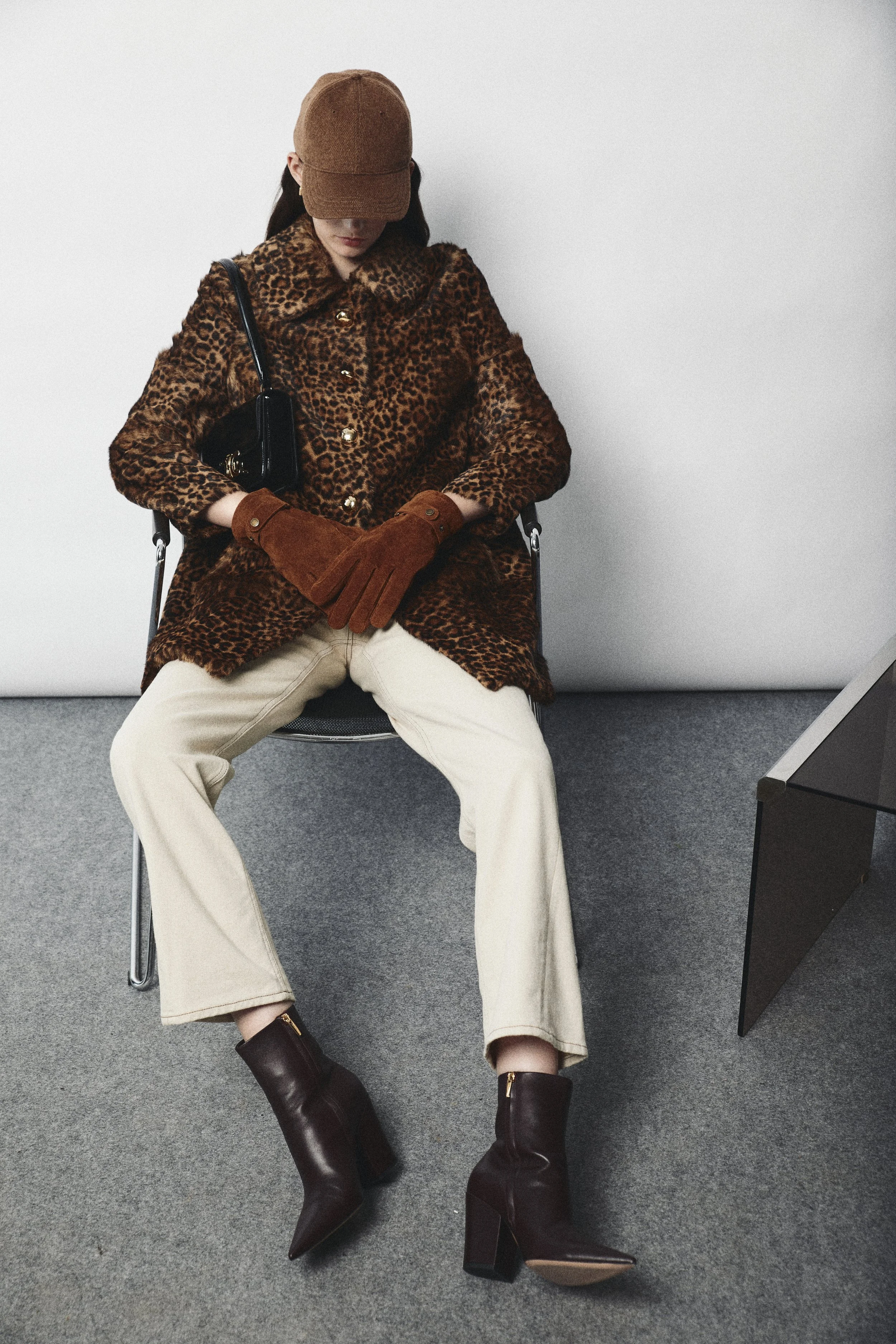 Coat in calfskin shearling and "Garance" bag in patent calfskin: all CELINE BY HEDI SLIMANE; Jeans, POMANDÈRE; Earrings, PDPAOLA; Hat and gloves: all STETSON; "Keinna bootie", GIANVITO ROSSI